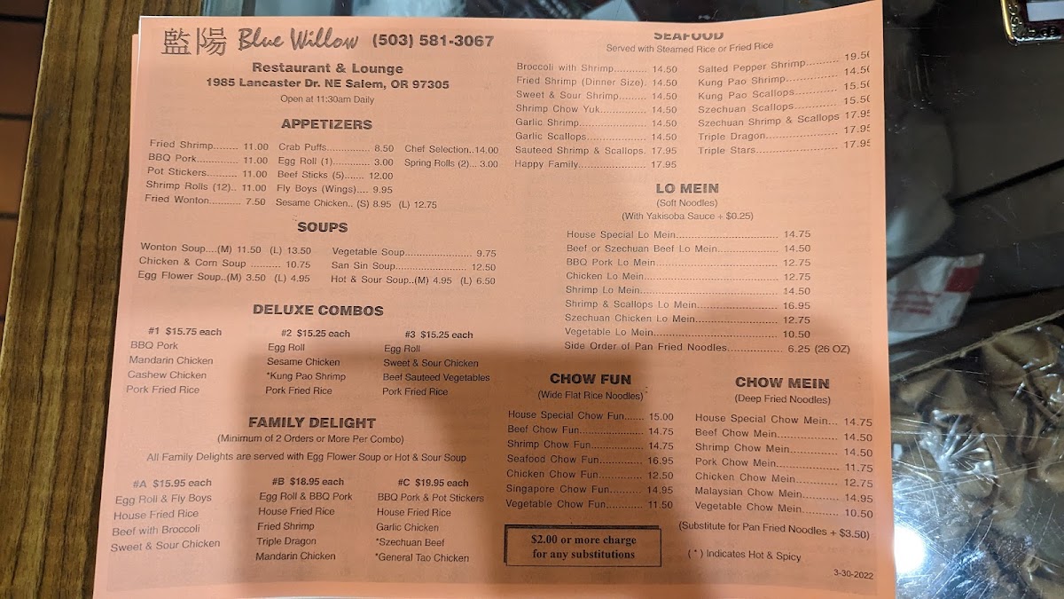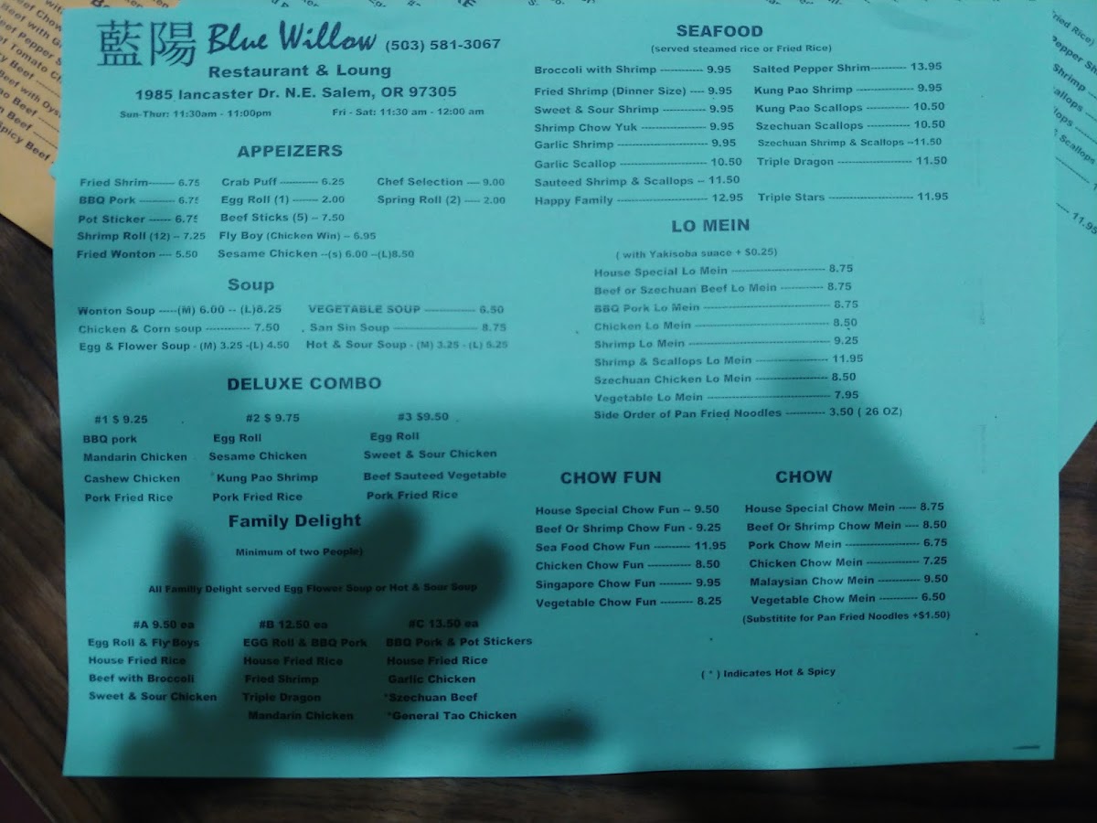 Welcome to Blue Willow Restaurant, a gem nestled in Salem, Oregon. This family-friendly establishment thrives on providing an authentic dining experience that captures the essence of American Chinese cuisine. The menu features a delightful array of dishes, including the savory Chef Salad at just $8.00 and the ever-popular Shrimp Louie for $6.75. For noodle lovers, their Singapore Chow Fun stands out, offering a deliciously spicy twist at $9.95.